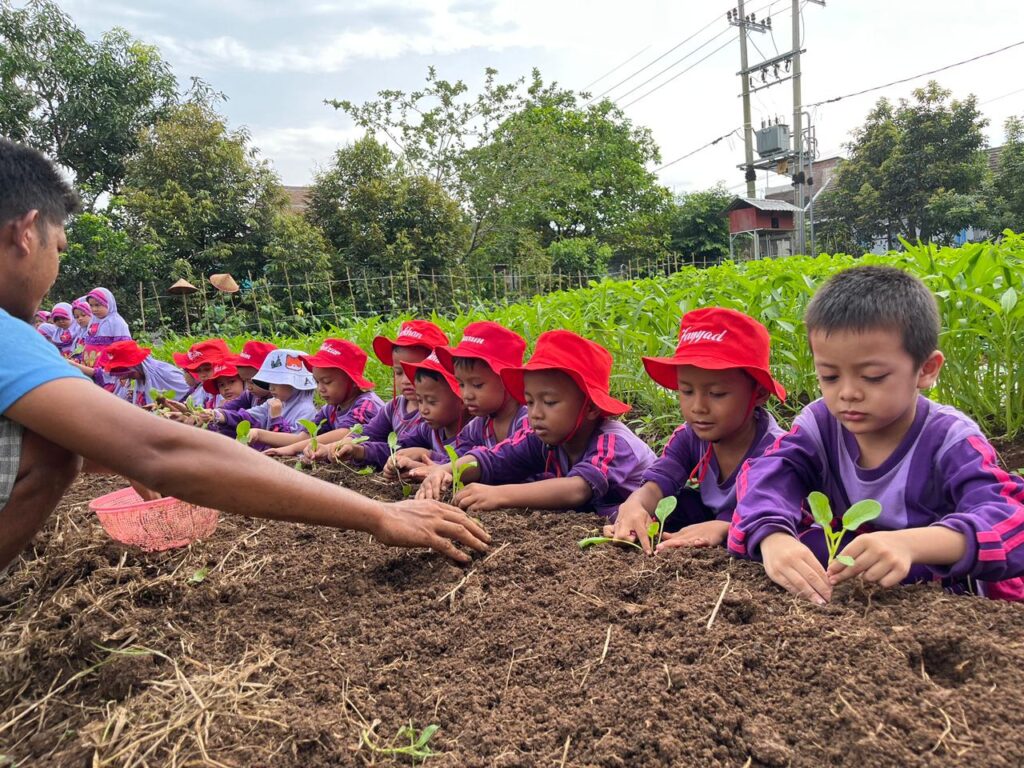 Setelah mendapatkan penjelasan dan contoh, anak-anak pun diajak untuk mempraktikkan langsung kegiatan menanam bayam. Dengan penuh semangat, mereka turun ke sawah dan mencoba menanam satu per satu. Meski kaki mereka bersentuhan langsung dengan lumpur, hal tersebut justru menjadi pengalaman yang sangat berkesan dan menyenangkan bagi anak-anak.